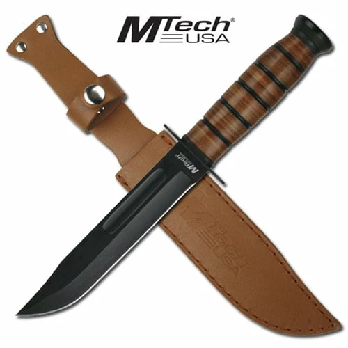 12″ Overall Length Mtech Fixed Blade Knife. 6.5″ Black 440 Stainless Steel Blade with Wood Handle. Includes Leather Sheath