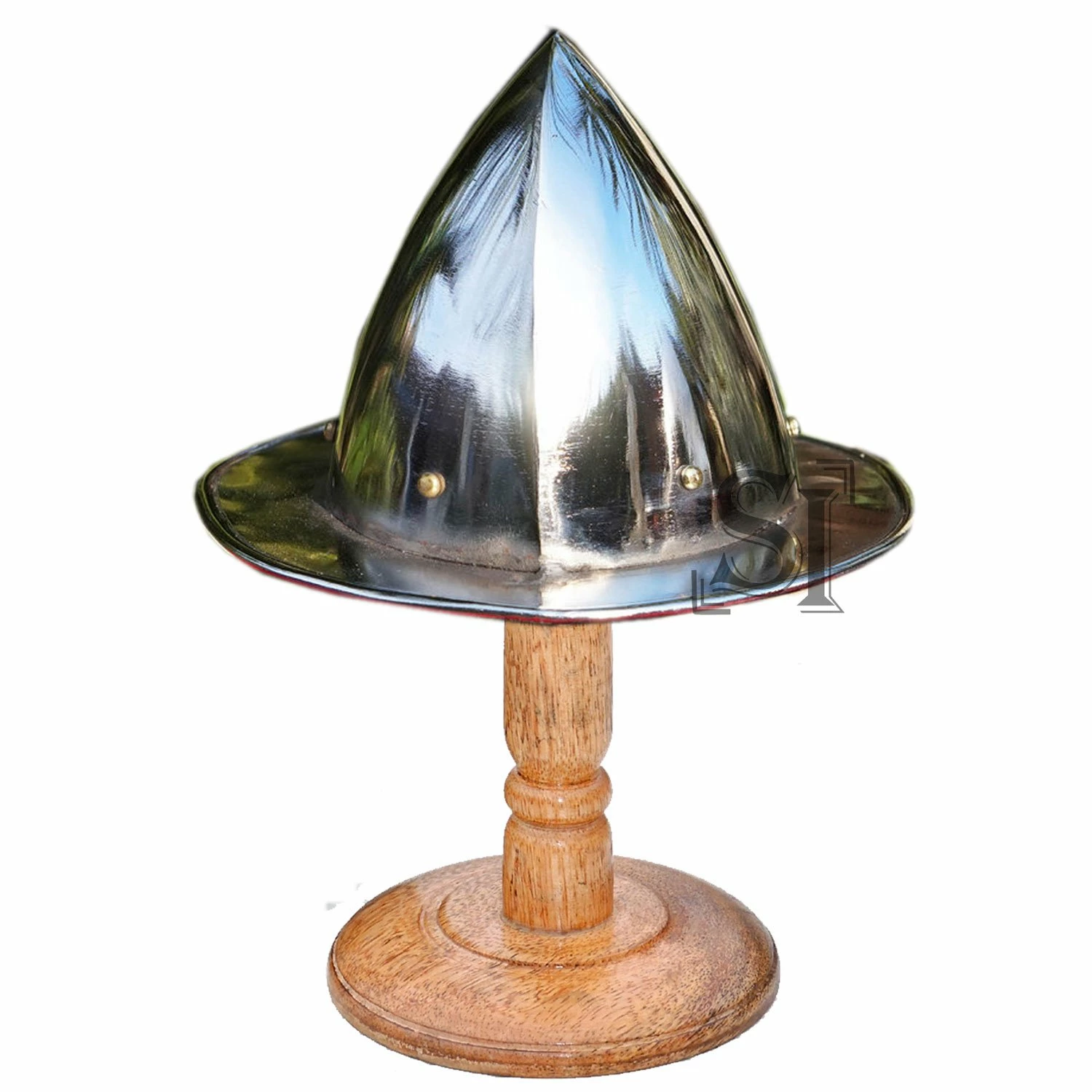 This miniature has the same look as a full sized Kettle Hat Knight Infantry helmet. This miniature Kettle Helm is crafted from steel, it comes with a wooden mini helmet stand for display. It makes a fine office accessory, paperweight, or a notable defensive upgrade for the garden gnome.