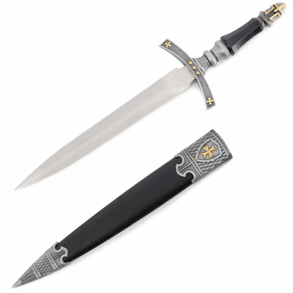 The knight templar dagger comes with a curved crossguard. The crossguard curves towards the blade. The hilt continues with a black grip. The hilt ends with a helmet-like pommel. Finally, this dagger comes with a matching black scabbard. You can add this Royal Arms Medieval Crusader Templar Dagger to your medieval outfit or your decor. It displays wonderfully in any home or office.