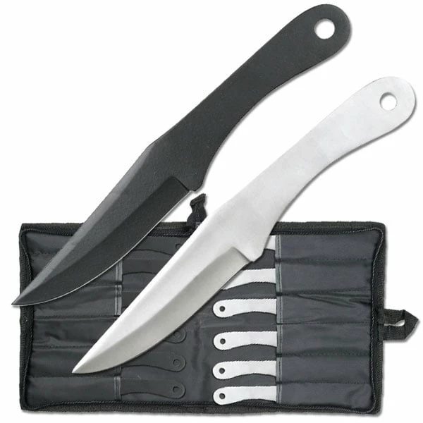 8.5 Inch Overall Length Throwing Knife 12 Piece Set. 6 Black Stainless Steel Throwers. 6 Silver Stainless Steel Throwers. Includes Nylon Sheath