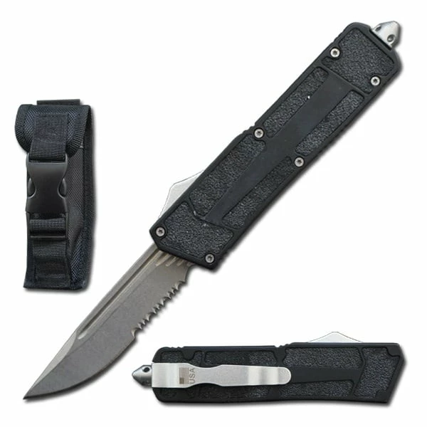 The stone washed blade is made from stainless steel. The handle has a zinc alloy casing with a sandpaper texture for working in wet conditions. The slider is located on the side to propel the blade forward and retract. The dual action function is a popular feature on OTF knives. A glass breaker completes the butt just in case of emergencies. Included are a steel pocket clip and a quick release nylon sheath.