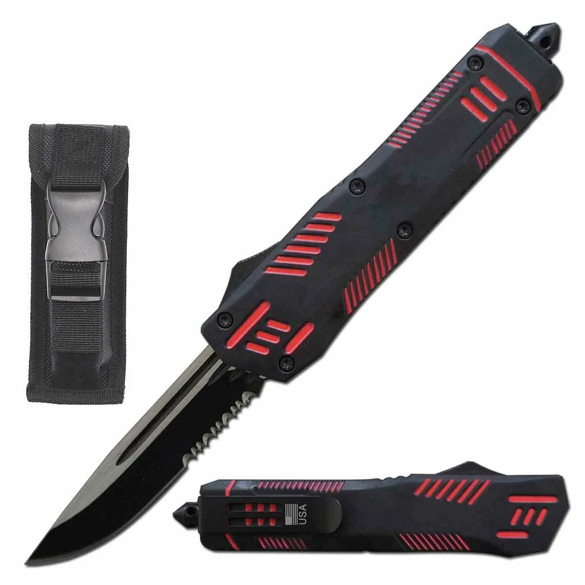 The Pitbull OTF knife represents a great balance of functionality, usability and value. The Pitbull has a zinc alloy black handle with grip inserts ensuring you can hold on to this knife. The partially serrated singe edge drop point style blade is stainless steel two tone finish. The firing button is mounted on the side making the Pitbull slim and easy to carry. The pocket clip is mounted on the back. These knives feature an improved internal mechanism for more consistent firing. Overall Length 9 inches with Handle Length of 5 inches. Includes FREE Nylon Pouch with Belt Loop.