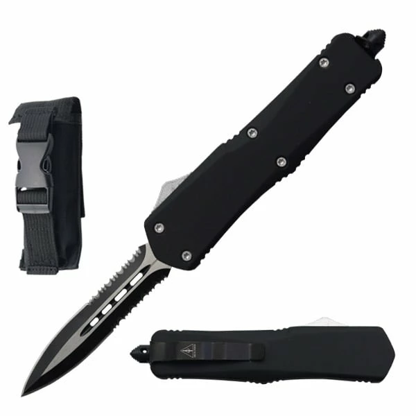 The spear point style blade of this automatic out the front knife is constructed from stainless steel, and features a black and metallic silver finish. Partial serration on the blade allows for this knife to be used as a multipurpose tool, capable of sawing through tick rope or cord with ease.