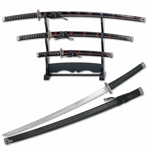 3 Piece Samurai Sword Set. 40 Inch Overall Length Katana Sword. Stainless Steel Blade. Black Cord Wrapped Handle. Includes Display Stand