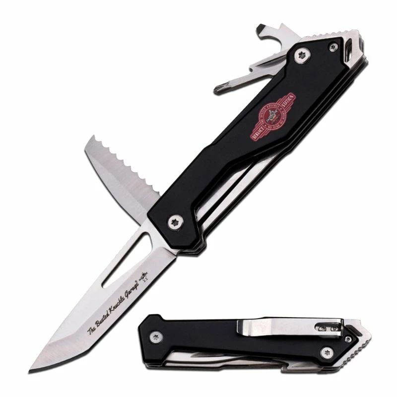 Busted Knuckle Garage manual folding knife with multi tools including bottle opener, saw blade and screwdriver. The knife comes in new box.