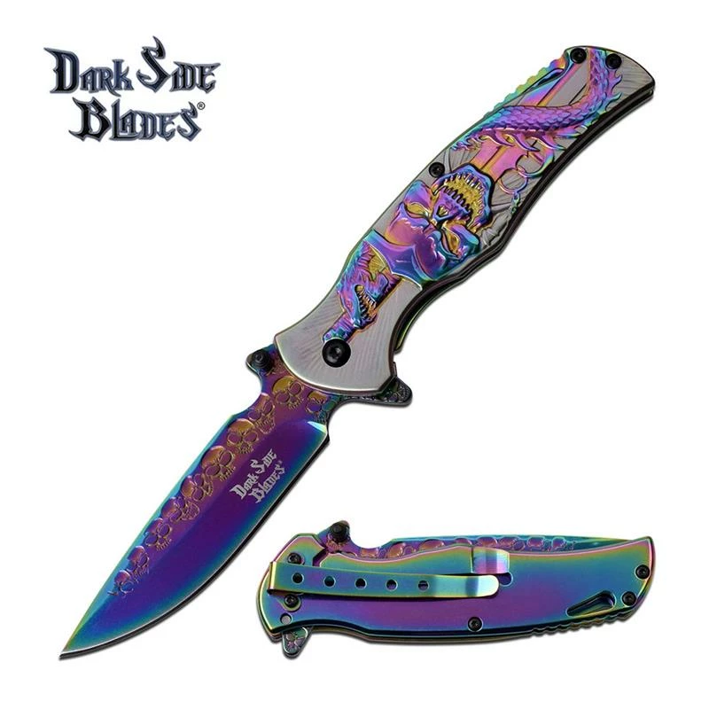 Dark side blades skull and dragon design spring assisted folding pocket knife. 8 inch overall open length knife. 3.5 inch rainbow tinte coated 3cr13 steel blade. 4.5 inch rainbow tinte coated and etched two tone stainless steel handle. Knife includes pocket or boot clip.