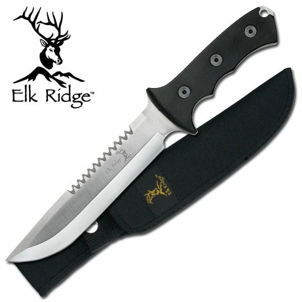 12.5″ Overall, 6.75″ Blade. Full tang Stainless steel blade with reverse serration. Black wood handle with lanyard hole.