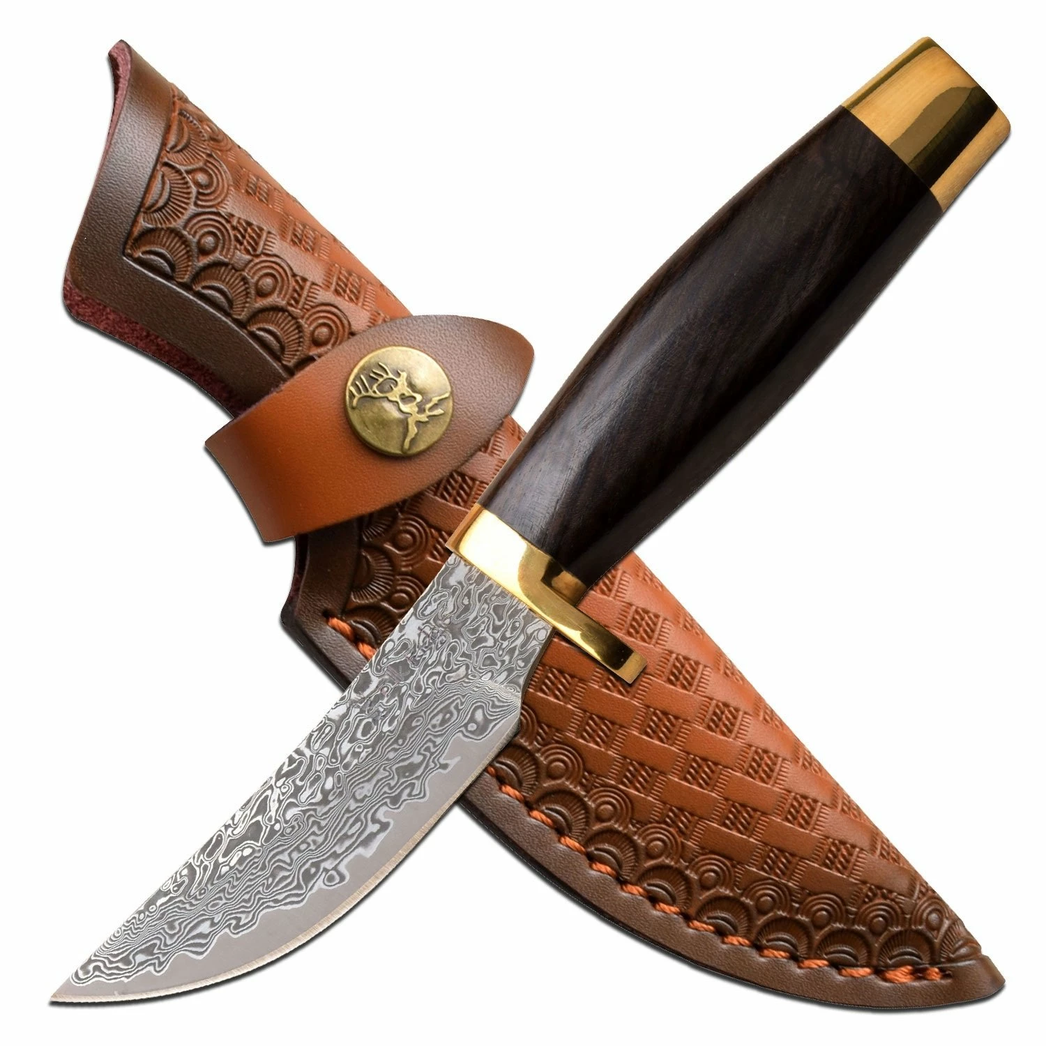 - SPECIAL FEATURES: Fixed Blade Knife, Full Tang Construction, Genuine Damascus Stainless Steel Blade, Polished Wood Handle, Includes Genuine Leather Sheath for Easy and Safe Carry.