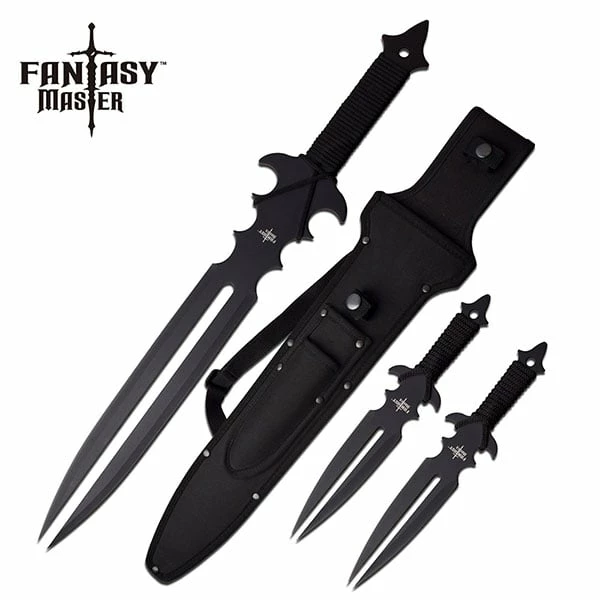 Fantasy Master 22.5 Inch Dual Blade Sword with 2 Piece Throwing Knife Set. Includes Nylon Sheath