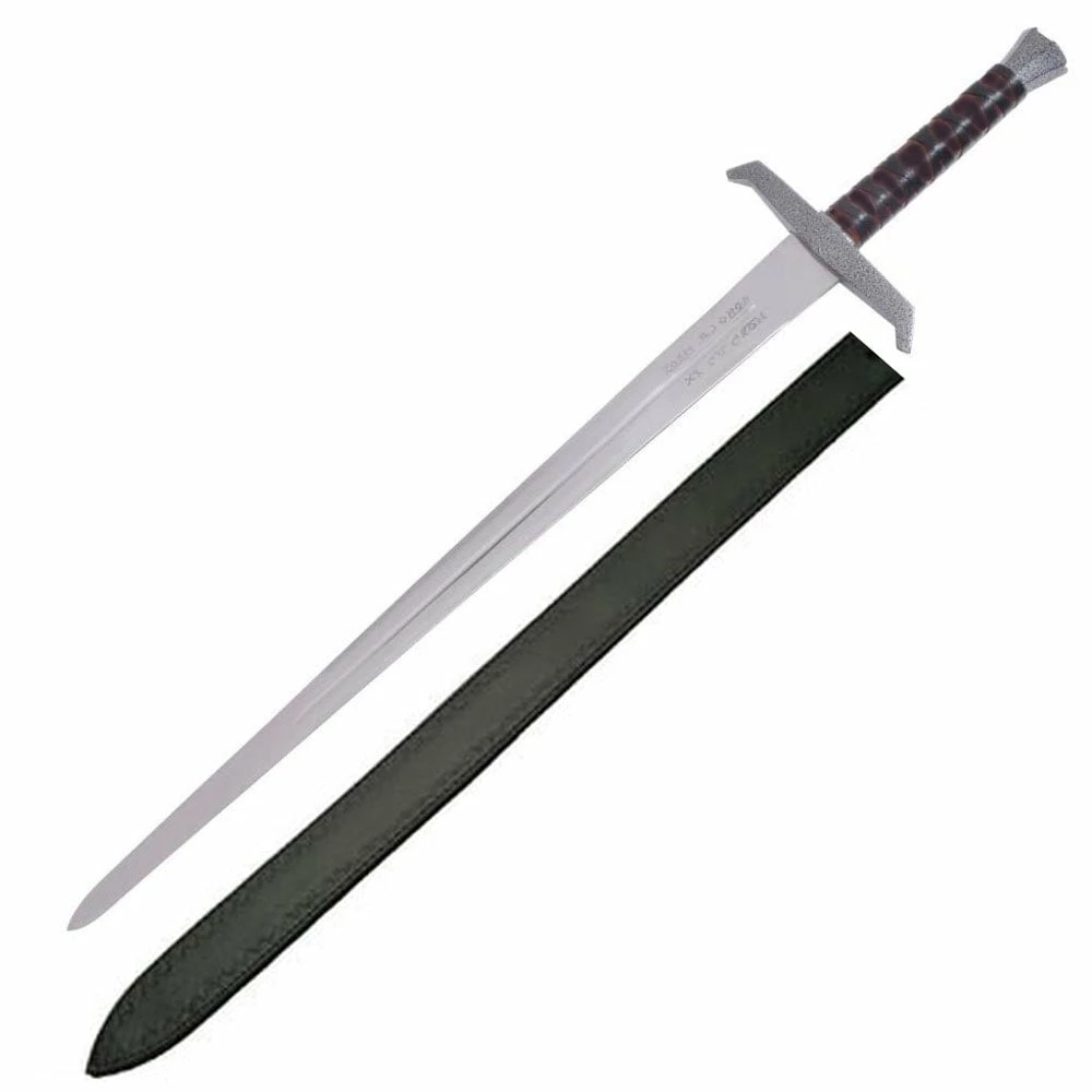 Features an elegant, full tang stainless steel blade, inscribed with the famous words; “Take me up, cast me away.” in runic lettering. The handle is handcrafted from hardwood, and wrapped in faux-leather, for a comfortable one or two hand grip. The pommel and guard are made from aluminum alloy, and finished in a gorgeous antique looking silver enamel coating.