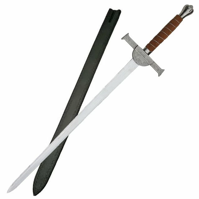 This sword is constructed from stainless steel with a 33 inch blade. It features an intricate cross guard with the MacLeod name and the family’s insignia. The handle is covered with brown
