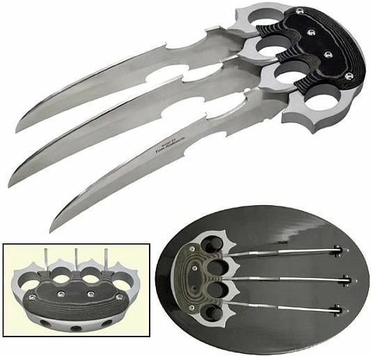 Tom Anderson’s Pantera Claw. Three grand, curving claws extend out from between four knuckle-guards. From each blade, a half-circular section has been stylishly cut out, first from the top, and then from the bottom farther down, where the blade begins, running along the inside edge of the curve. The grip features a Spanish micarta wood overlay, secured in place by four bolts. The blades are made from 440 stainless steel. Great cats have great claws, among other powerful features.