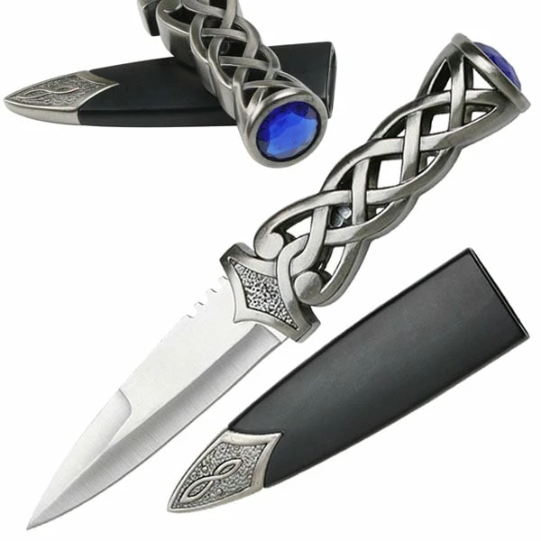 9 Inch Overall Length Medieval Knife. Stainless Steel Blade With Blood Groove. Stainless Steel Handle With Blue Ruby. Includes Hard Scabbard