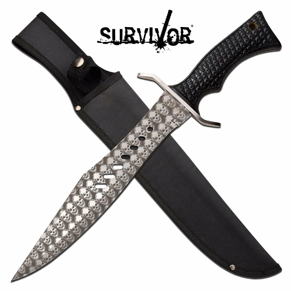 Bowie knife with 11.75 inch long skull design blade. The survival knife is 17.25 inch and comes in a new box with nylon sheath.
