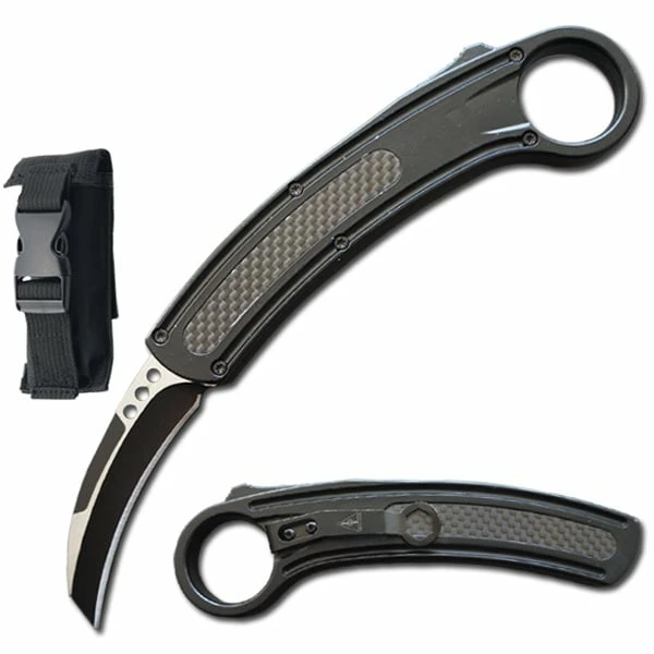 The popularity of automatic knives has risen significantly over the last few years, especially OTFs. The stainless-steel blade deploys out the front as usual with these types of automatic knives, but at a curve following the handle. This curved blade features a black and silver finish and sharp cutting edge.