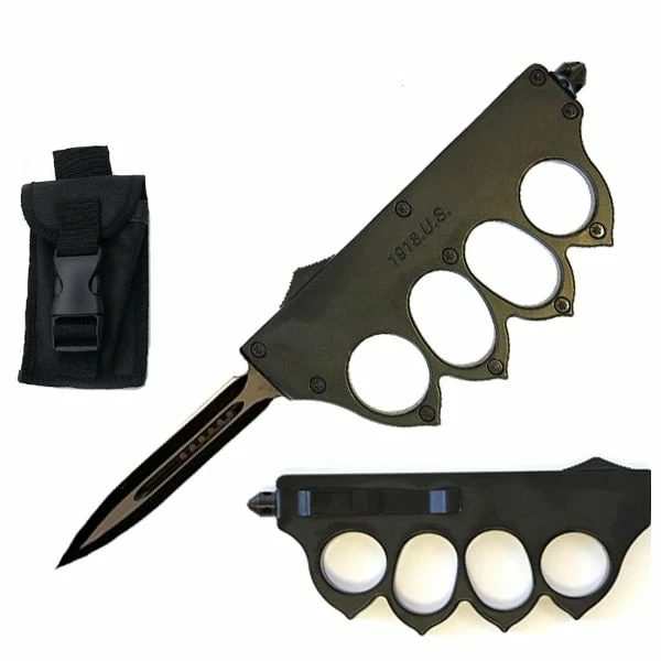 The trench knuckle OTF is one of the toughest knives we carry. It is a double action OTF knife with 440 dual tone stainless steel blade. The black knuckle handle is steel frame that includes a pocket clip and glass breaker stub. The glass breaker is a great tool to have for emergency situation where a window may need to be broken. The side of the handle features a slide that you push up to deploy the blade and in the same motion pull back to retract.