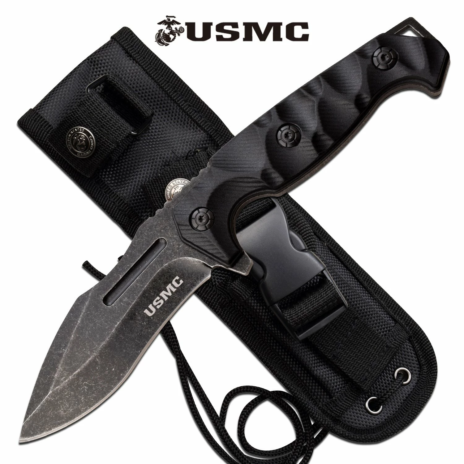 United States Marines fixed blade knife. The knife is 9 inches long with 4 inch steel stonewashed blade. Knife handle is 5 inches long and made from injection molded nylon fiber. Comes with tactical nylon sheath.